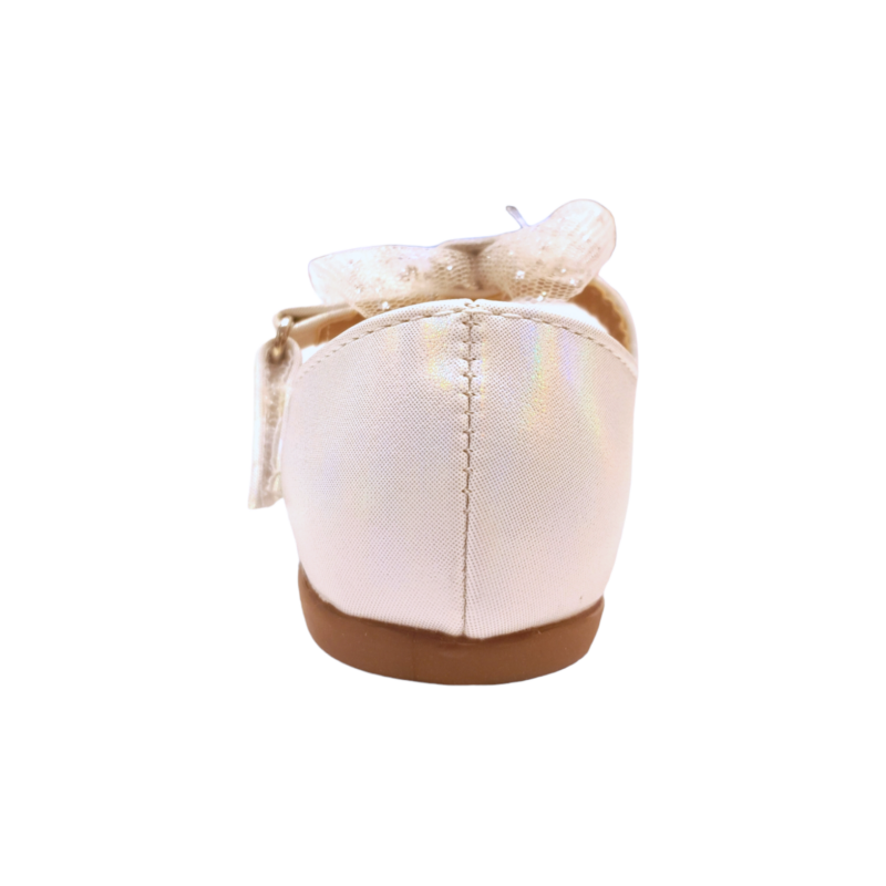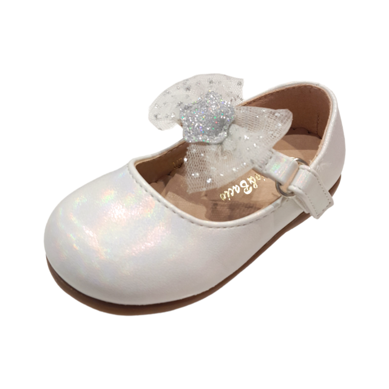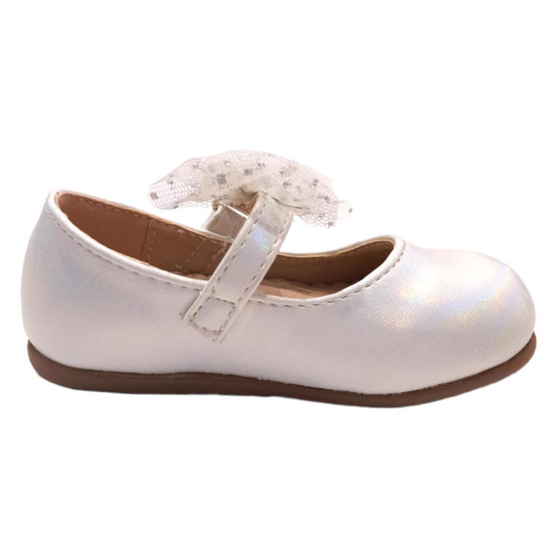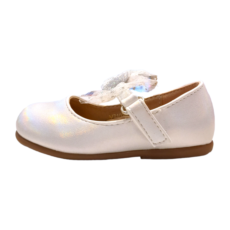 Ballerina bianco metallizzato con cinturino e fiocco in tulle glitter – BACIO & BACIO