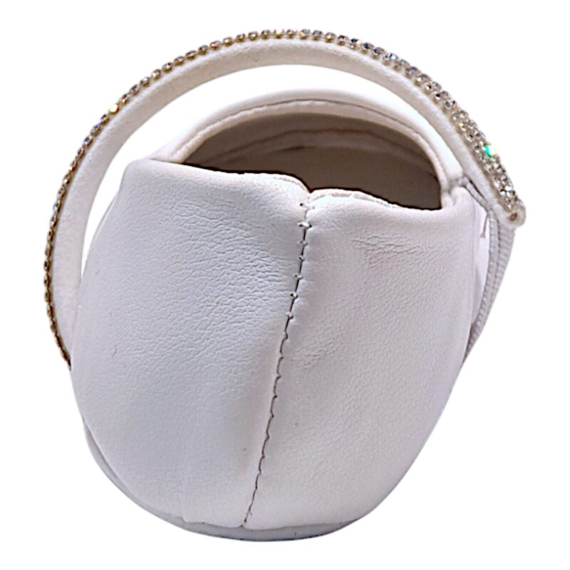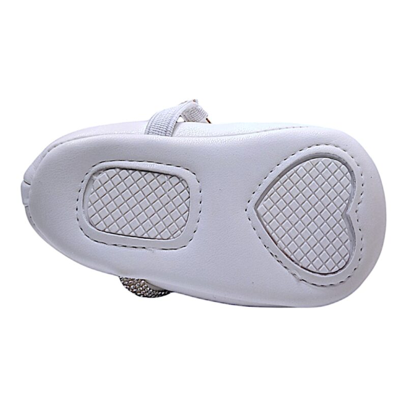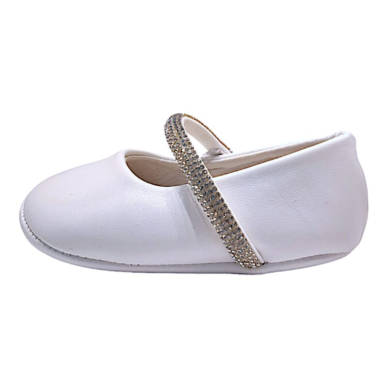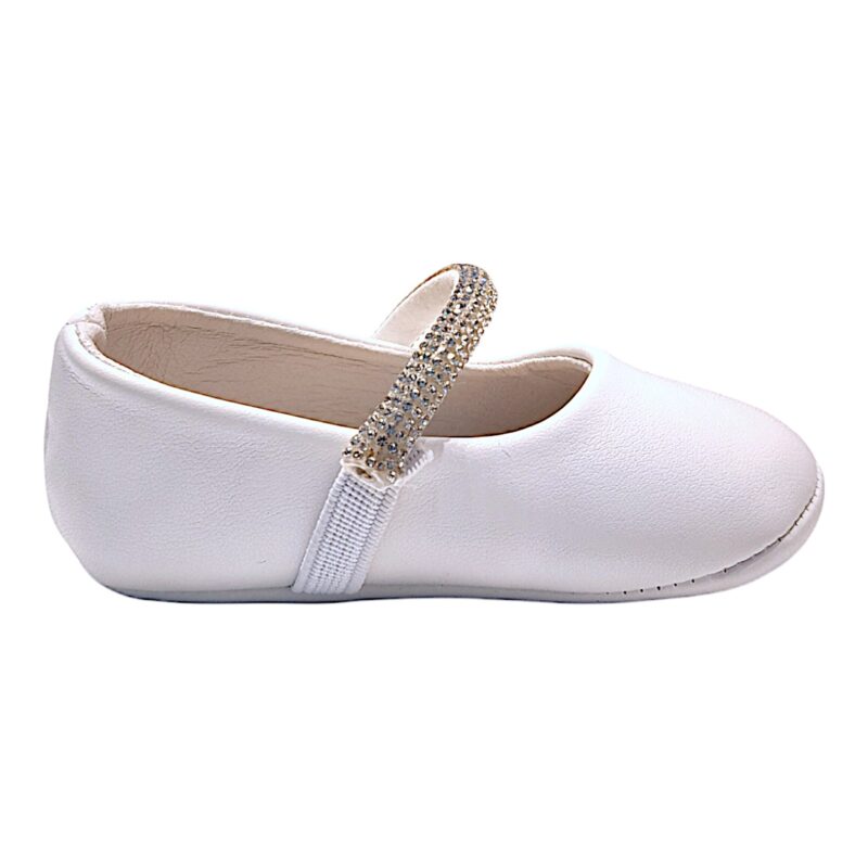 La linea semplice ed elegante è arricchita dalla fascia elasticizzata con piccoli strass luminosi, un dettaglio brillante che dona un tocco prezioso senza rinunciare alla delicatezza tipica delle scarpe baby.