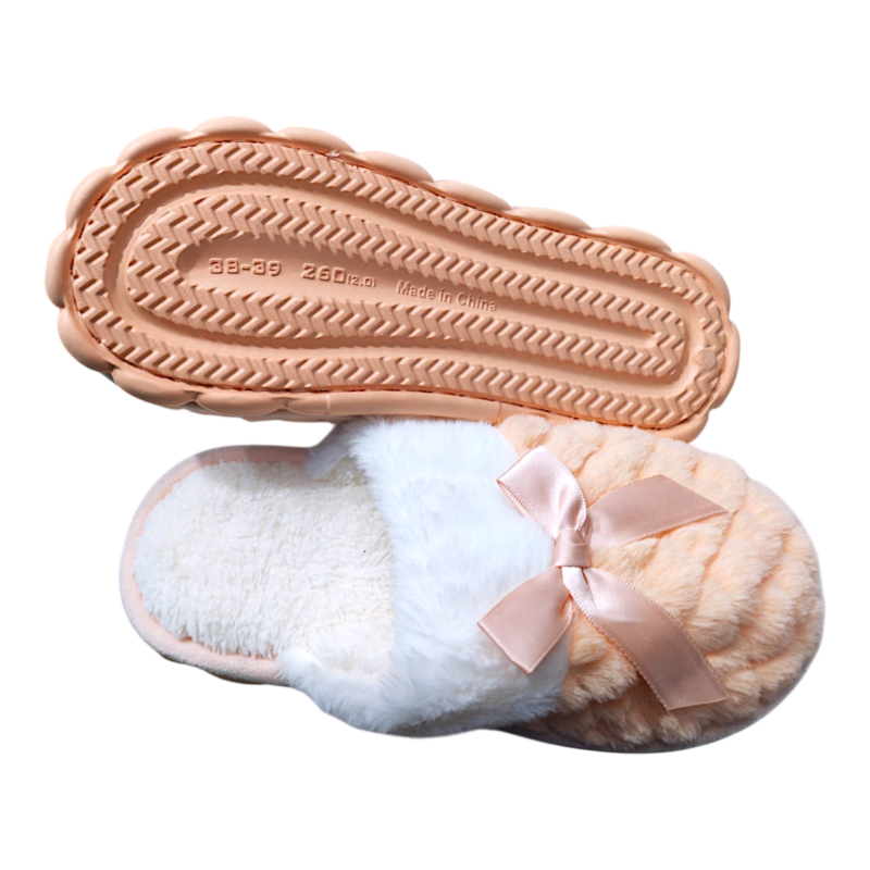 La ciabatta presenta una tomaia in tessuto effetto peluche color pesca, arricchita da un fiocco decorativo che dona un tocco elegante e raffinato. Il bordo superiore bianco in morbida pelliccia sintetica rende il modello ancora più caldo e accogliente.
