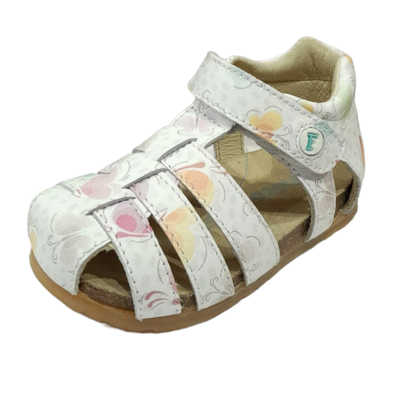 Sandalo a ragnetto Alby bianco con farfalle multicolor e apertura a strappo – FALCOTTO