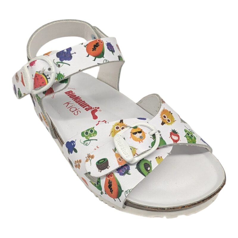 Sandalo primi passi bianco aperto, sportivo, in pelle, impreziosito da stampa decorativa di frutta, ideale per una bimba che ama muoversi e divertirsi