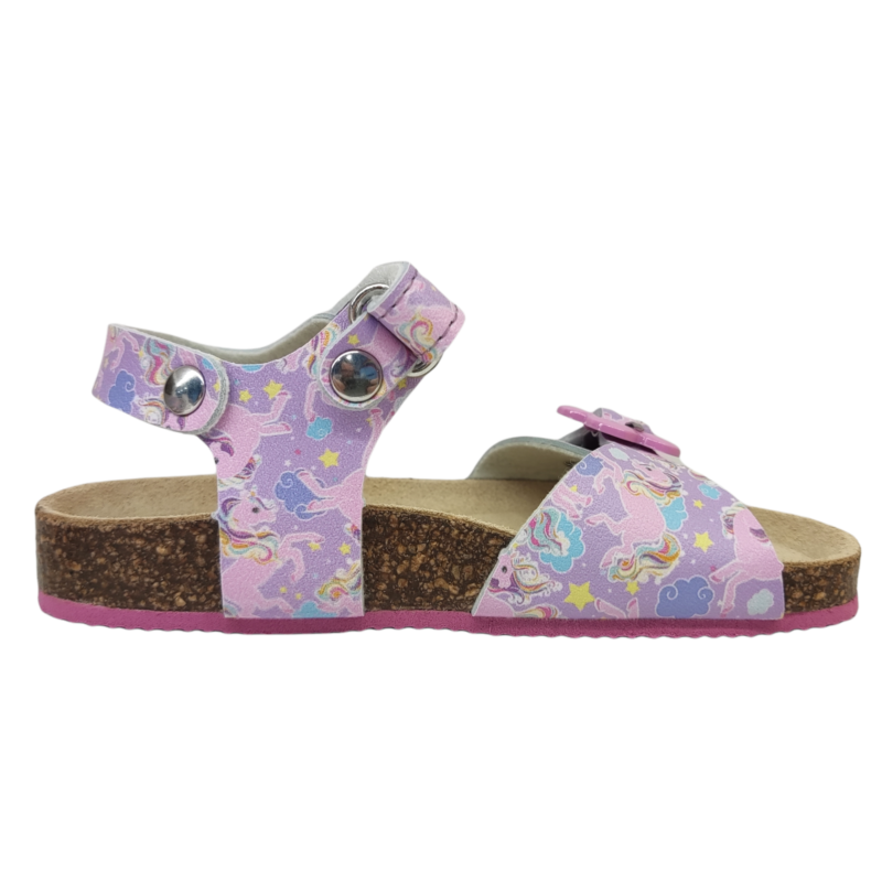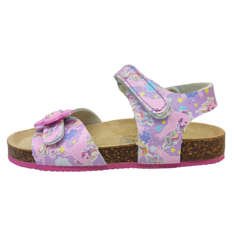 Sandalo bambina lilla con fantasia unicorni e fibbia a fiore