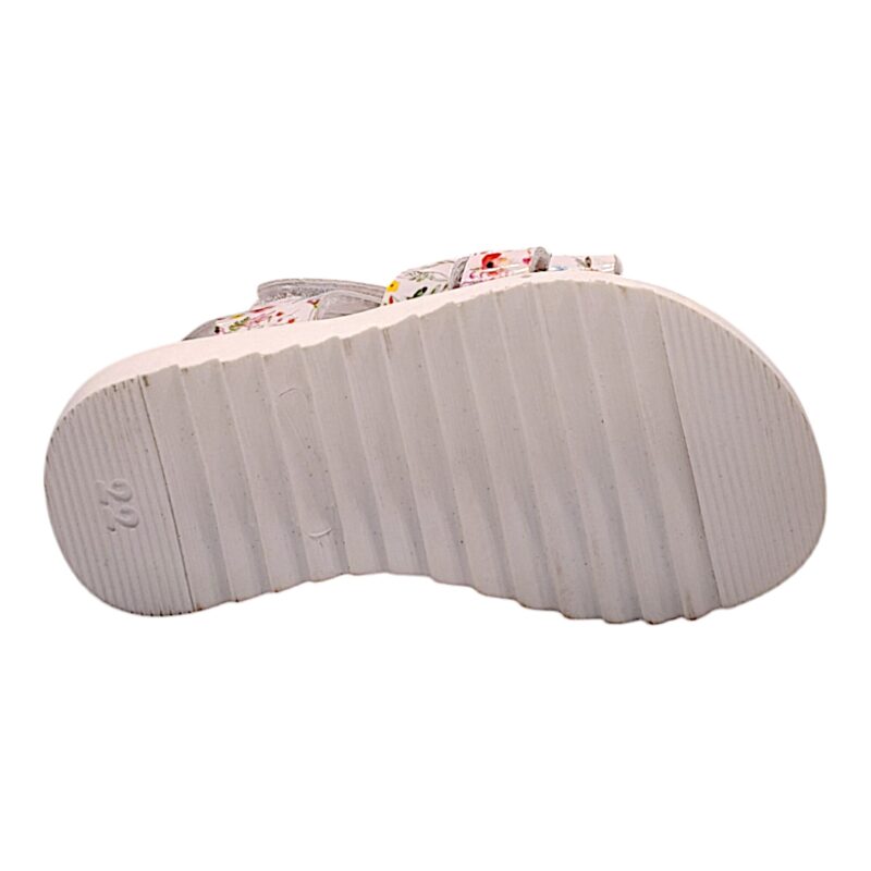 Questo dolcissimo sandalo primi passi è decorato con una vivace fantasia floreale e una farfalla glitterata impreziosita da fiorellini sulla fascia anteriore. Ideale per accompagnare i primi passi delle più piccole con allegria e stile.