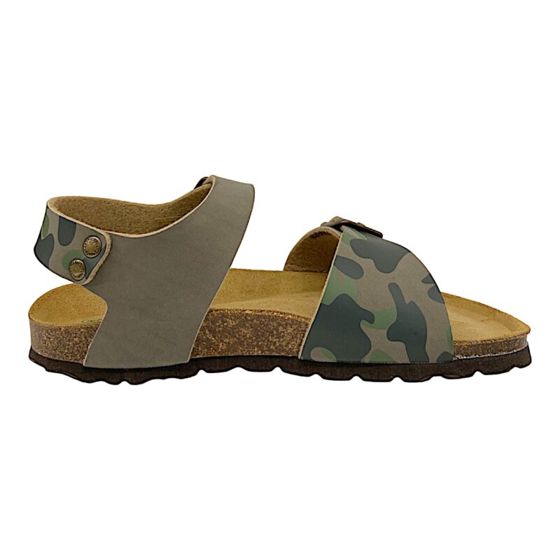 Ciabatta/sandalo di colore grigio fango/mix blu con stampa mimetico/militare, perfetta per un bambino/ragazzo. Ottima in tutte le circostanze, ideale per l’estate