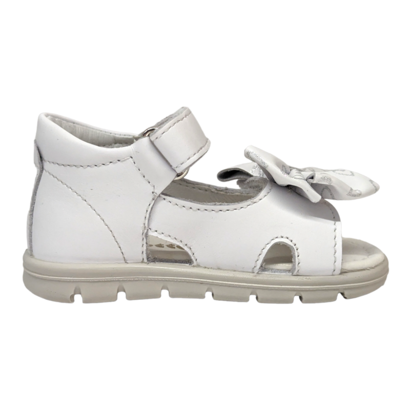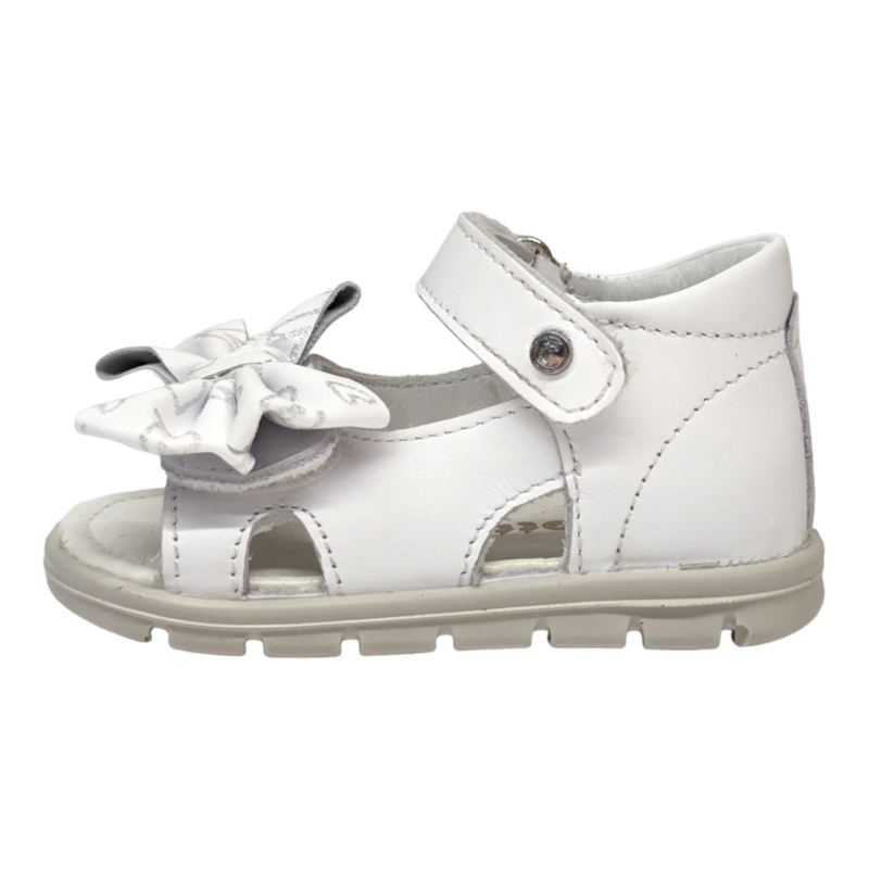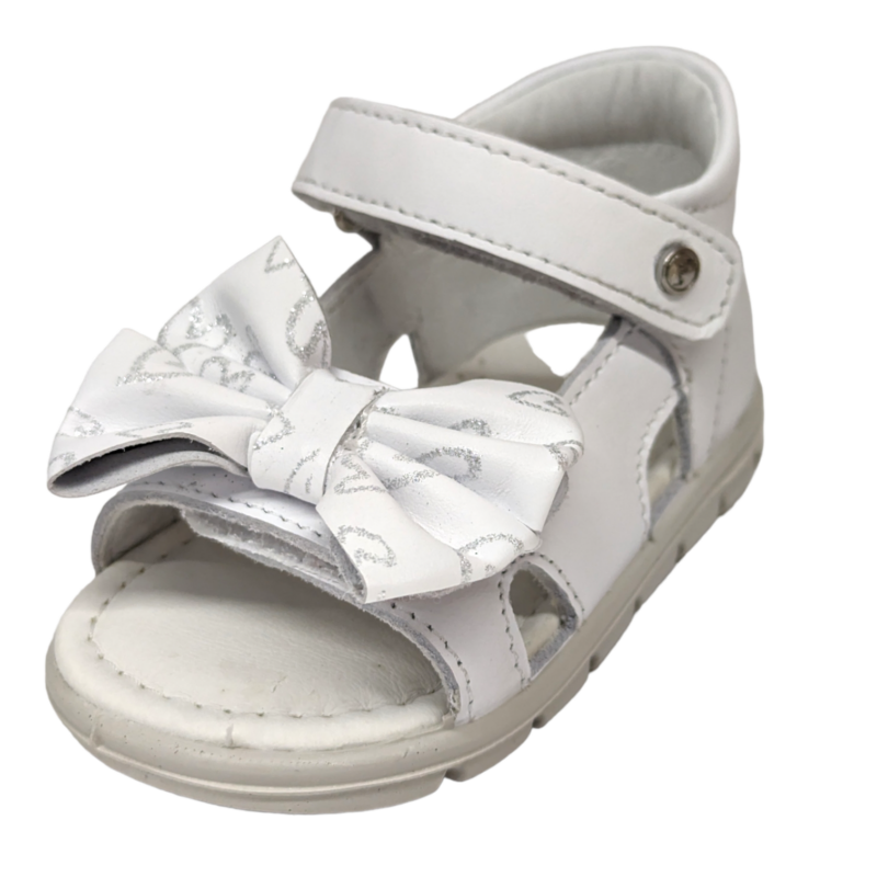 Elegante e delicato, questo sandalo Falcotto è pensato per accompagnare i primi passi con comfort e sicurezza. Il colore bianco luminoso è impreziosito da un grande fiocco frontale decorato con piccoli cuori argentati, un dettaglio raffinato che rende la scarpa perfetta per l’estate e per gli outfit più dolci delle bambine. ✨👣