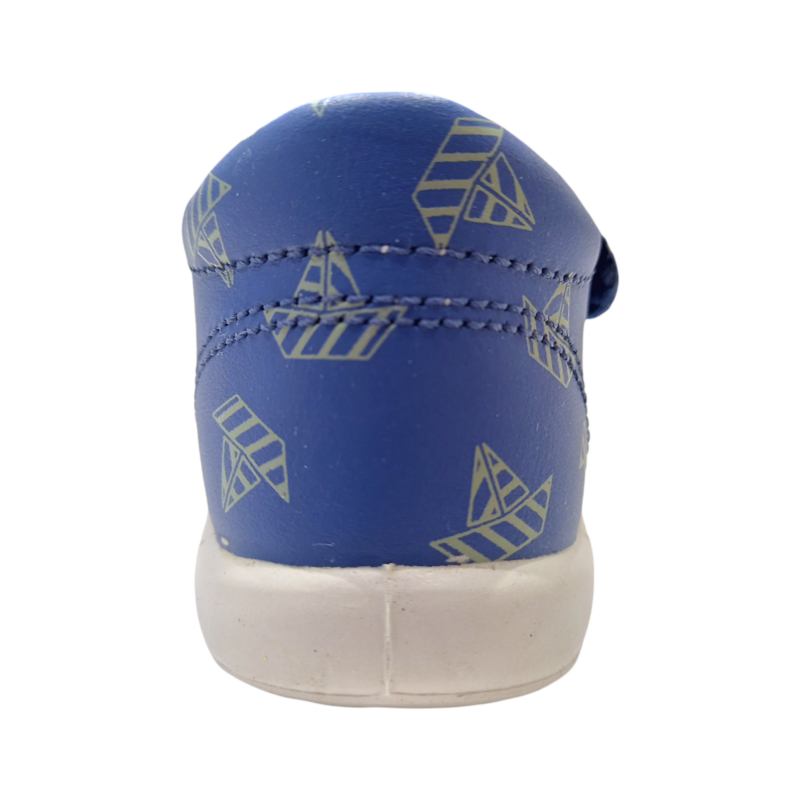Il colore blu delicato è arricchito da piccoli dettagli ispirati al mare, come il disegno di barchette che dona un tocco giocoso e vivace. Dalla foto si nota la struttura avvolgente con cinturino alla caviglia e fascia anteriore regolabile con fibbia decorativa, oltre al pratico doppio strappo che facilita la calzata. La soletta color milk e la suola bianca creano un contrasto elegante e luminoso.