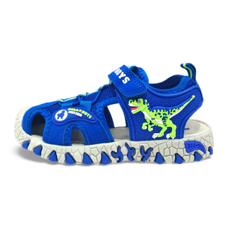 Perfetto per accompagnare le avventure estive del tuo bambino, questo sandalo ragnetto BULL BOYS unisce comfort, sicurezza e divertimento in un unico modello dinamico e sportivo. Il colore royal blue, vivace e grintoso, è arricchito da dettagli ispirati al mondo dei dinosauri e da luci integrate che rendono ogni passo ancora più coinvolgente. 💙