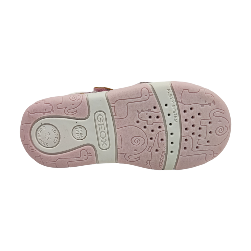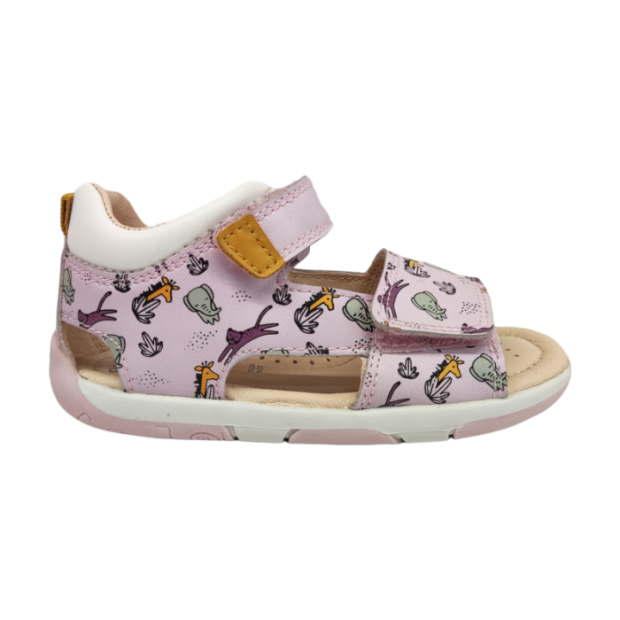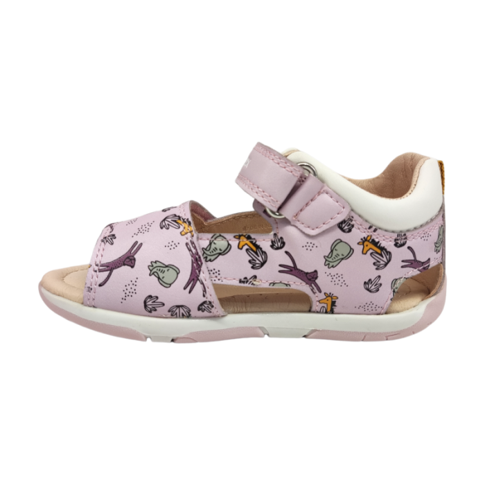 Sandalo rosa allegro dal look femminile e romantico, aperto nella parte anteriore, reso unico da colorati disegni di simpatici animaletti della savana e da un look delizioso sui toni del rosa.