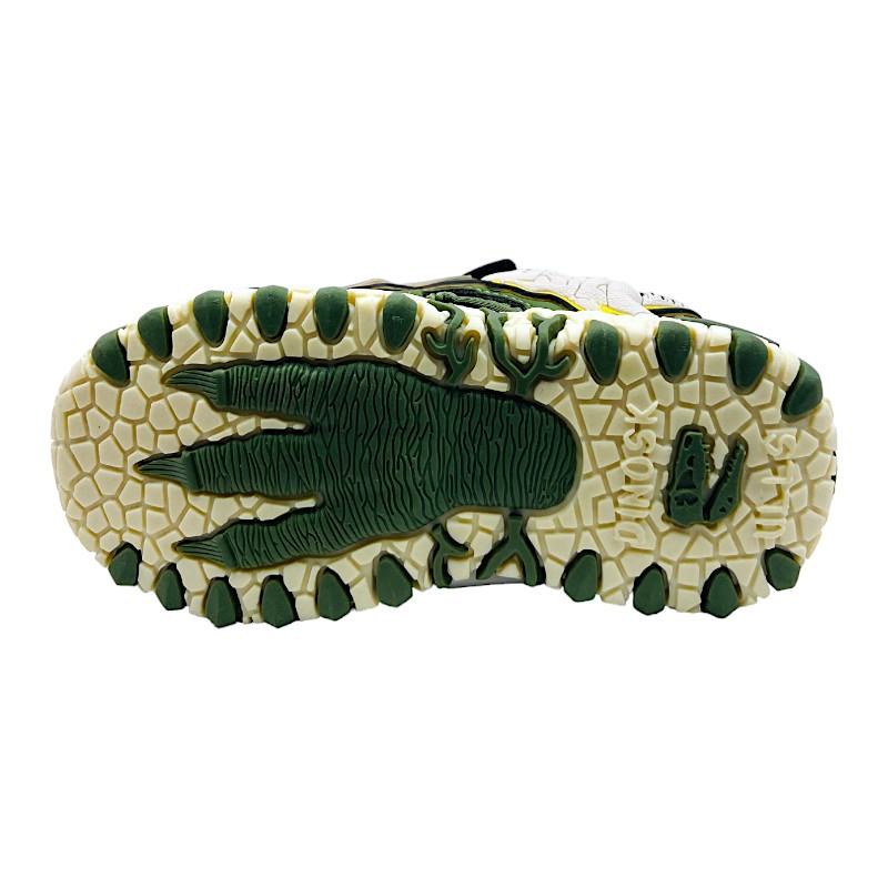 La particolare suola scolpita effetto impronta assicura un buon grip sul terreno e aggiunge un ulteriore richiamo al mondo dei dinosauri, unendo funzionalità e stile.