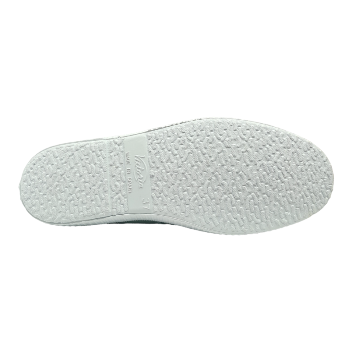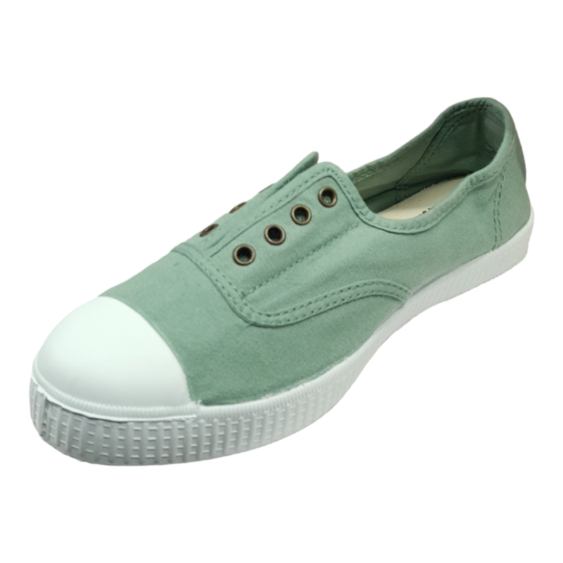 Classica scarpa sneakers inglesina verde jade unisex di Victoria Shoes con tela di cotone riciclato DREC® (Dyeable Recycled Eco Cotton) e suola slip-on in gomma naturale vulcanizzata.