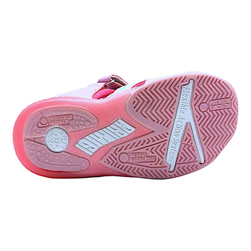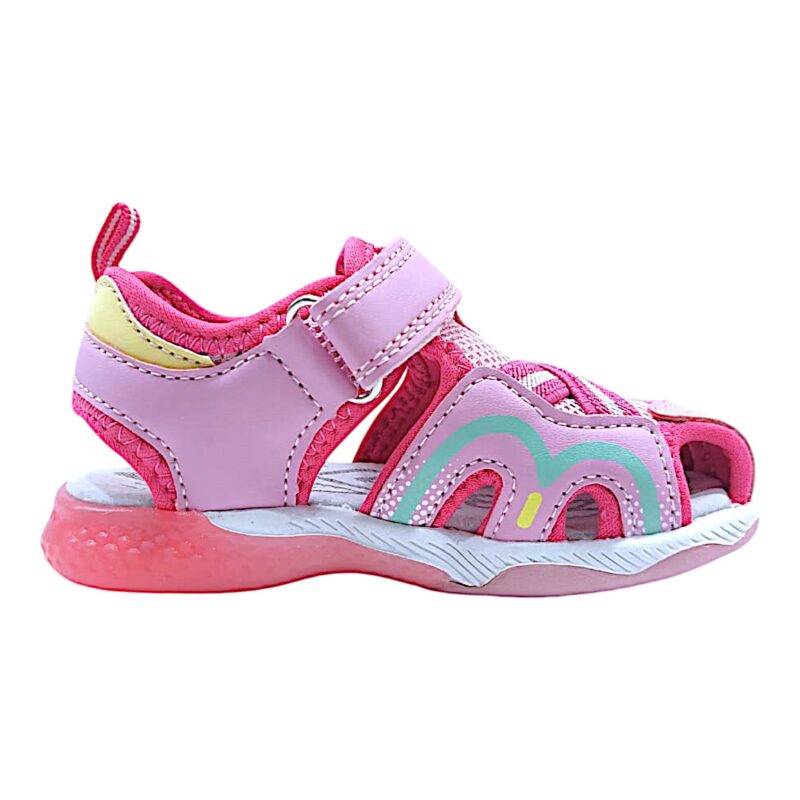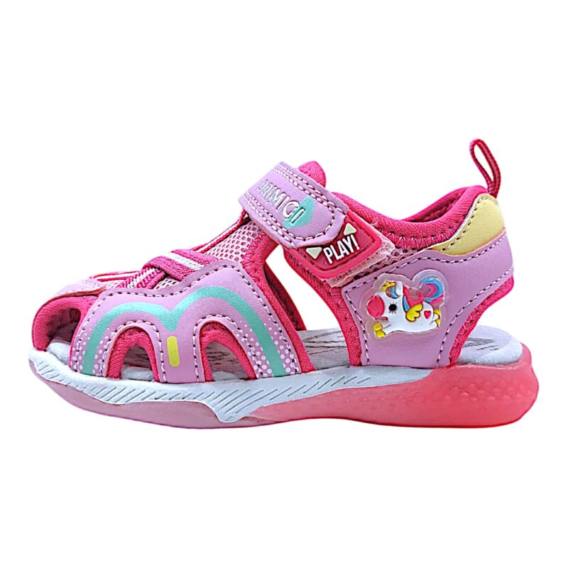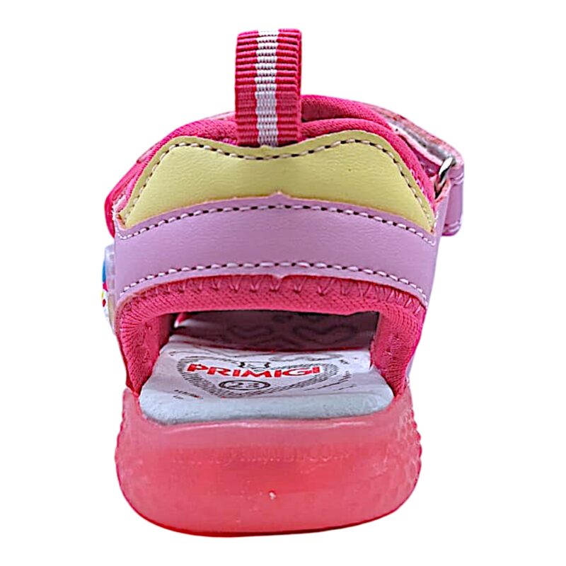 La tomaia in tessuto traspirante mantiene il piedino fresco, ideale per le giornate più calde, mentre lo strap pratico permette una calzata facile e veloce, perfetta anche per le bambine più vivaci.