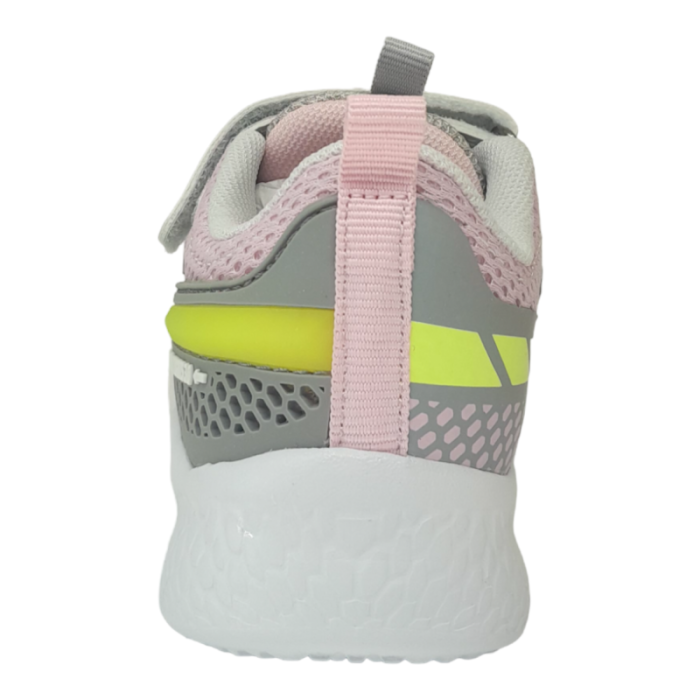 Scarpa sportiva d’ispirazione active con luci, dotate di pulsante on-off, in tessuto di colore rosa/argento con motivi decorativi.