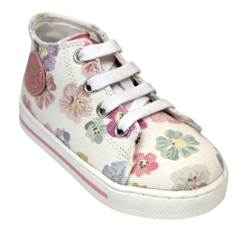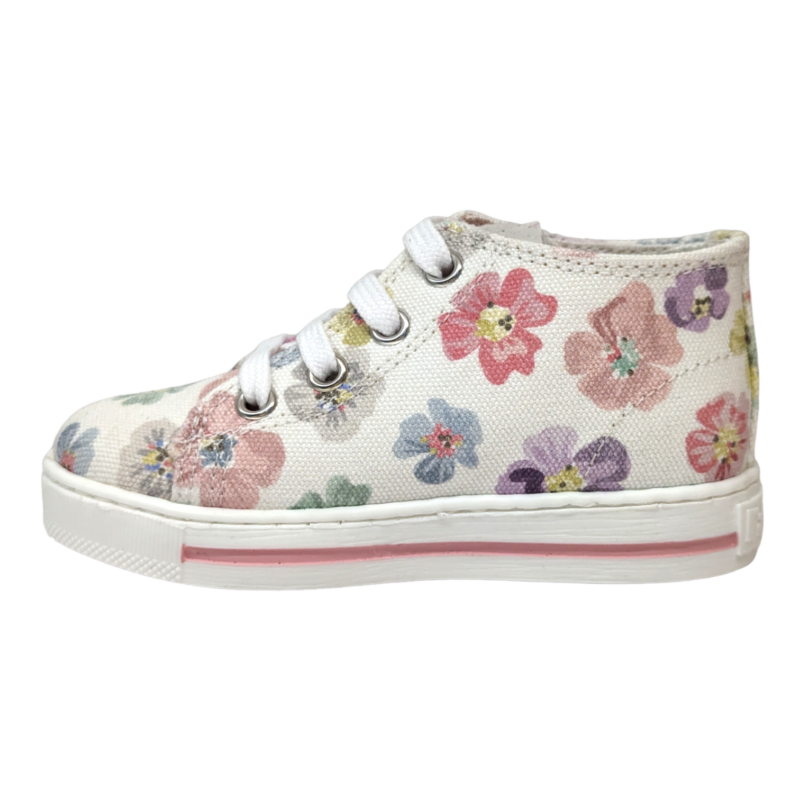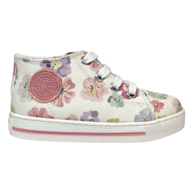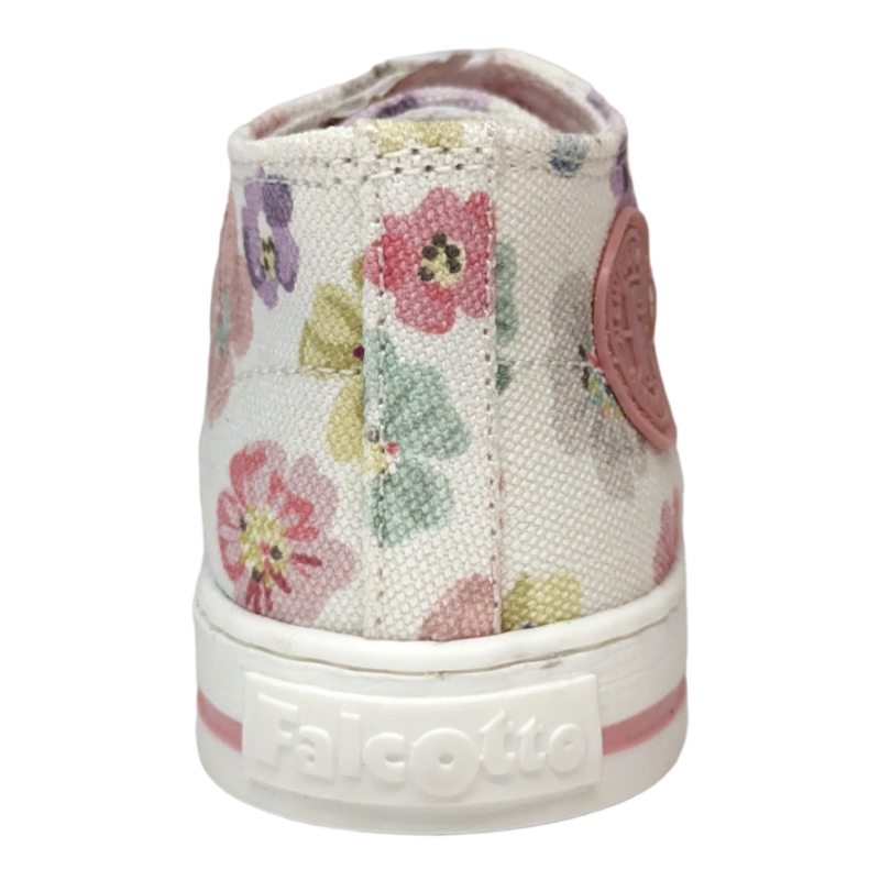 Dolce, colorata e perfetta per accompagnare le prime scoperte, questa sneaker Falcotto è pensata per la tua piccola che inizia a muovere i primi passi. Il fondo bianco è impreziosito da una delicata fantasia di fiori multicolor che rende la scarpa allegra e romantica, mentre il design ispirato al modello Converse dona un tocco sportivo e moderno. 👟🌸