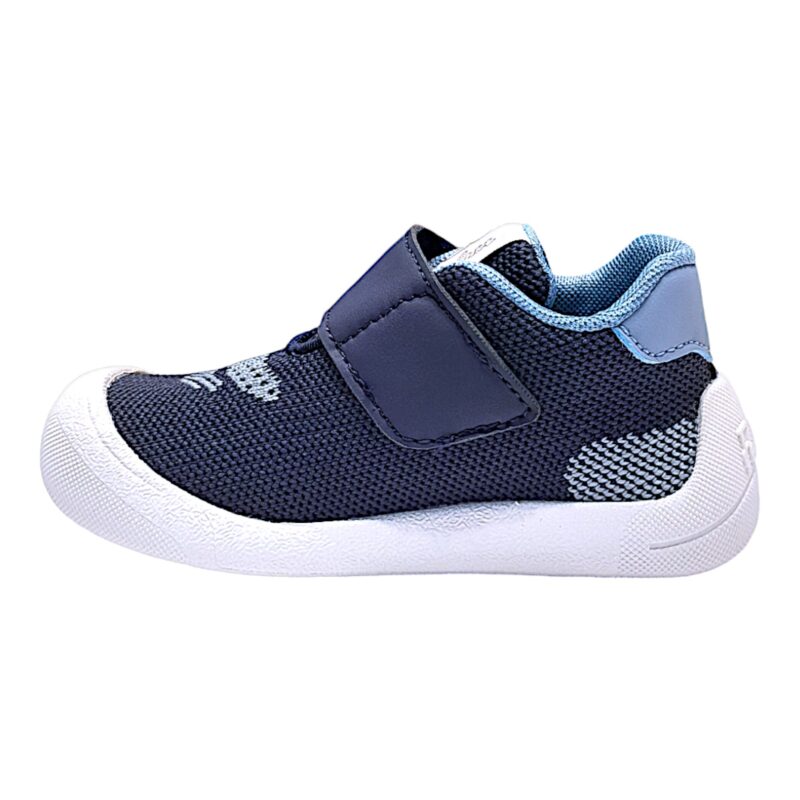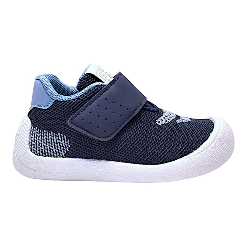Il colore navy è arricchito da dettagli celeste chiaro nella parte interna e dal logo frontale, creando un contrasto fresco e dinamico. La tomaia in tessuto lavorato dona un aspetto sportivo e contemporaneo, perfetto per completare gli outfit del tuo piccolo.