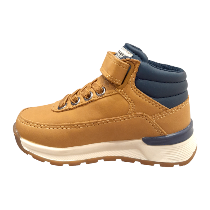 Stivaletto/sneaker Levi’s Ascot camel color ocra/blu per bambino primi passi con strappo a velcro, lacci tono su tono, occhielli in metallo e logo laterale.