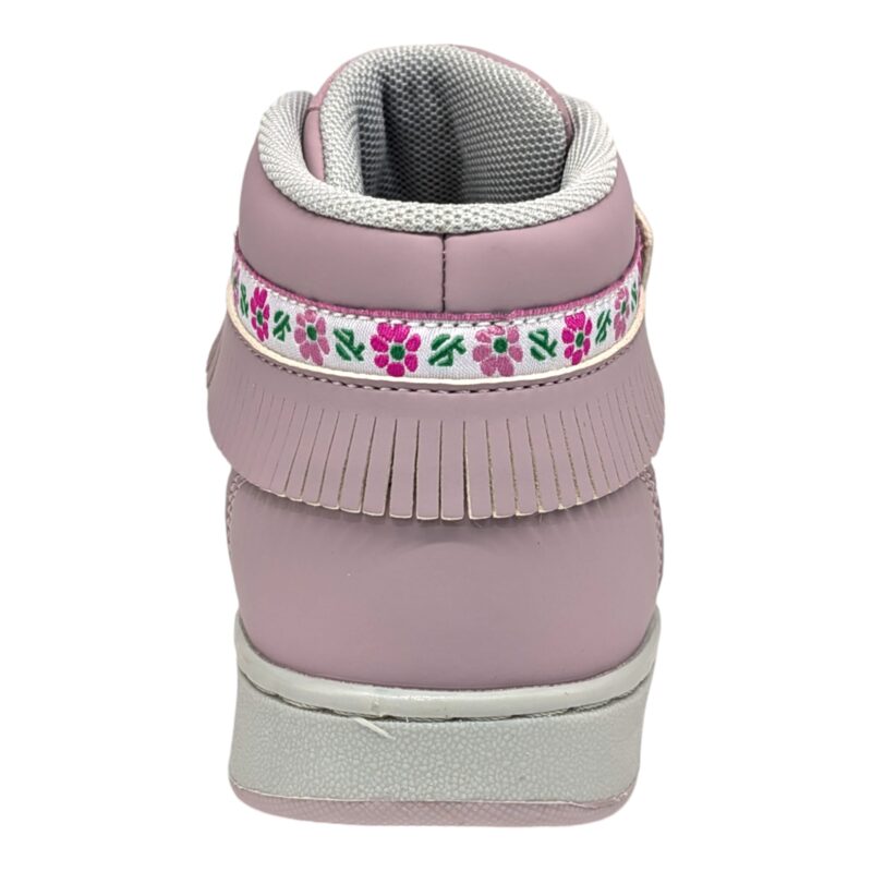 Questa riedizione delle sneakers Anni ’90 è impreziosita da un’adorabile frangia e una passamaneria floreale, che rendono la scarpa irresistibilmente raffinata. L’accessorio pendaglio diamantato a forma di mela aggiunge un tocco di magia, perfetto per le piccole amanti dello stile.