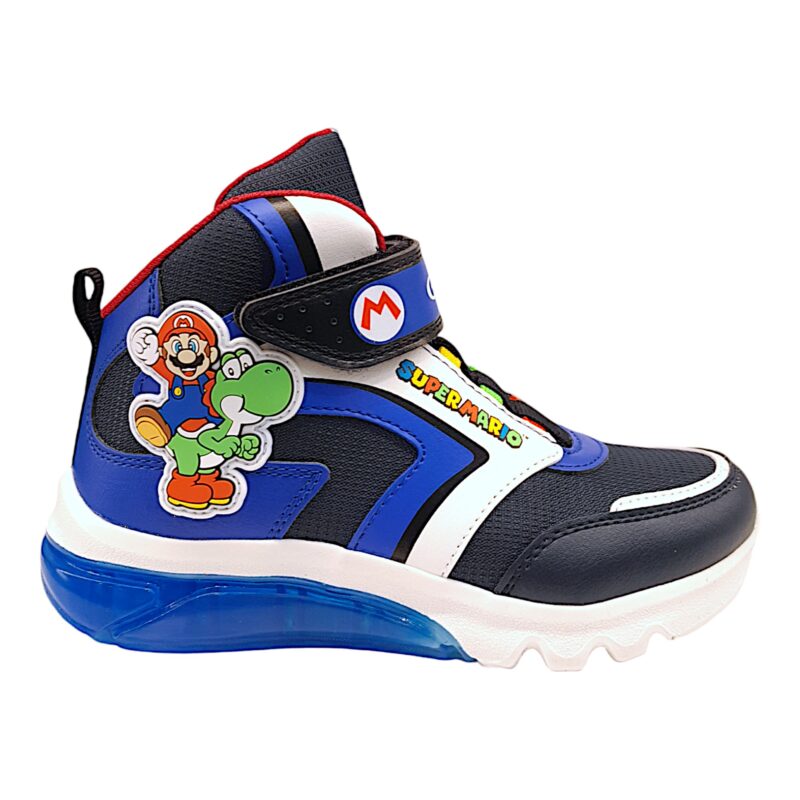 Colorata, divertente e perfetta per i piccoli appassionati dei videogiochi, questa sneakers alta Geox dedicata a Super Mario e Yoshi accompagna i bambini nelle loro avventure quotidiane con comfort e tanto stile. Il mix di blu navy, royal, bianco e rosso richiama i colori iconici del mondo Nintendo, mentre i personaggi laterali rendono la scarpa ancora più accattivante. Le luci integrate nella suola aggiungono un effetto dinamico che rende ogni passo ancora più entusiasmante. 🎮👦👟