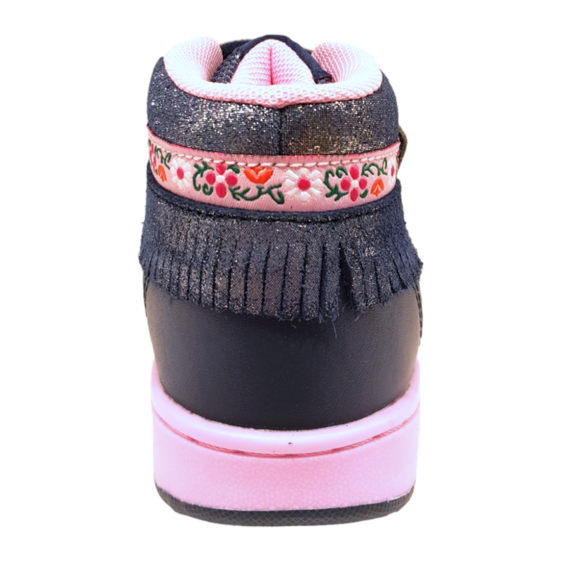 Decorate con frange e passamaneria, queste scarpe sono arricchite da un pendaglio diamantato a forma di rosa, cuciture decorative sulla parte anteriore, logo vintage sulla linguetta e sul lato e la scritta grande Lelly Kelly sulla suola.