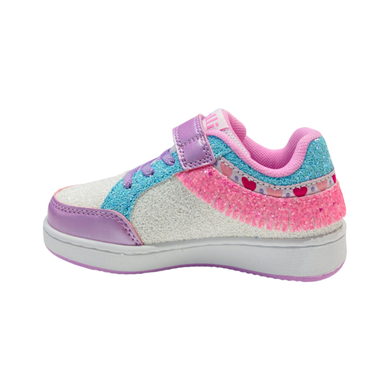Sneakers frangetta pan di zucchero bianco-lilla total glitter con strappo e lacci elastici – Lelly Kelly