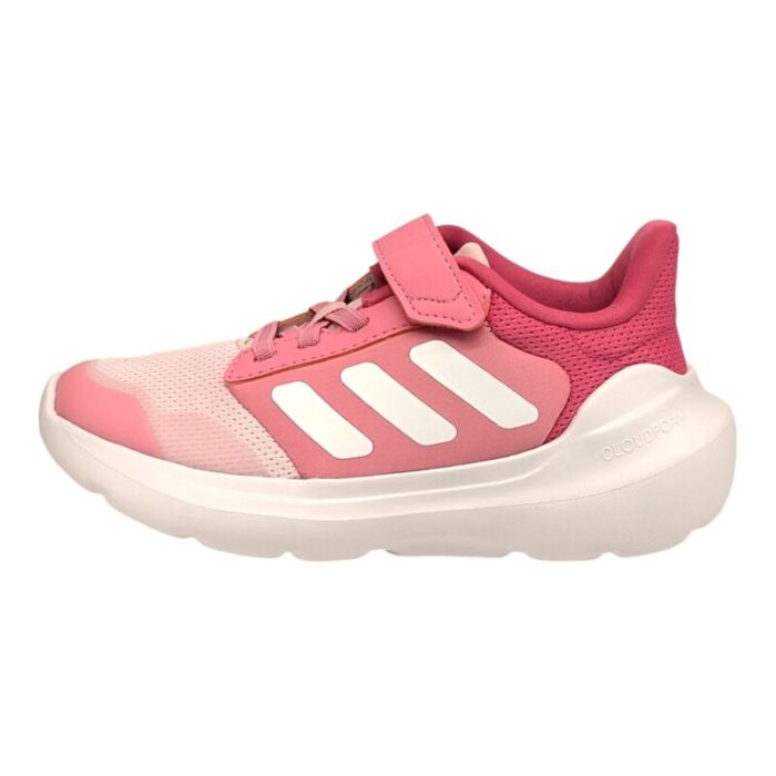 Sneakers Bambina Tensaur Run, di colore rosa con le iconiche bande Adidas a contrasto bianche.