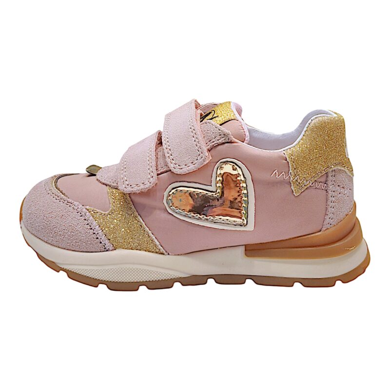 La tomaia rosa antico è valorizzata da inserti glitter oro e da un dettaglio laterale a forma di cuore che dona un tocco dolce e originale. Il mix di materiali e colori crea una sneakers moderna e facile da abbinare a tanti outfit casual.