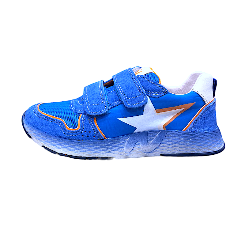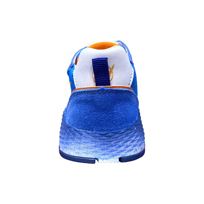 La tomaia presenta una vivace tonalità blu oltremare arricchita da inserti bianchi e dettagli arancioni che rendono la sneakers moderna e accattivante. La grande stella laterale aggiunge un tocco dinamico e distintivo al design.