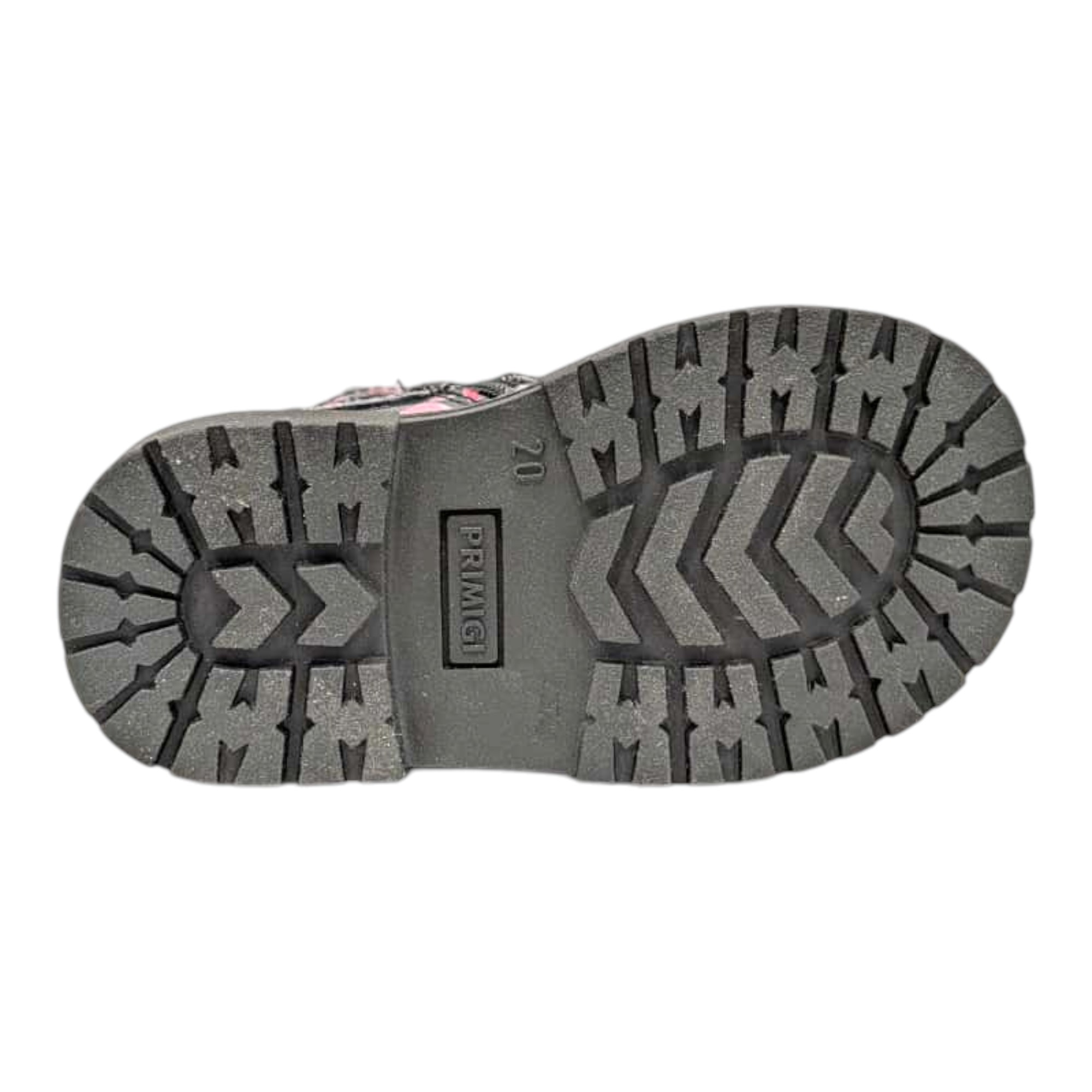 Stivaletto anfibio Primigi pensato per la bambina, dal carattere deciso e allo stesso tempo giocoso. Il modello è realizzato in similpelle nera, decorata con una fantasia all over di cuori nelle tonalità rosa e rosso, che rende lo stivaletto originale e facilmente riconoscibile.