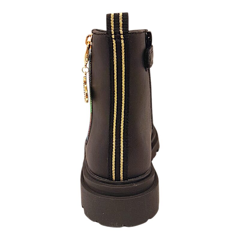 La tomaia in similpelle nera è resistente e facile da pulire, mentre la suola chunky carrarmata dona carattere al modello e assicura una buona aderenza durante il gioco e le passeggiate.