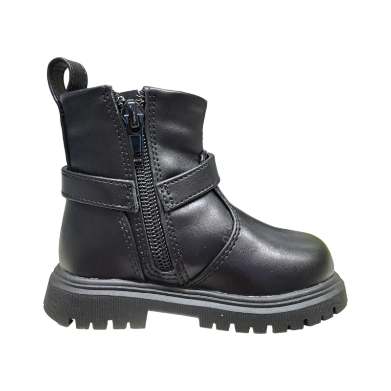 Stivaletto di colore nero per bambina con fibbia dorata, inserto decorativo e logo nella parte posteriore.