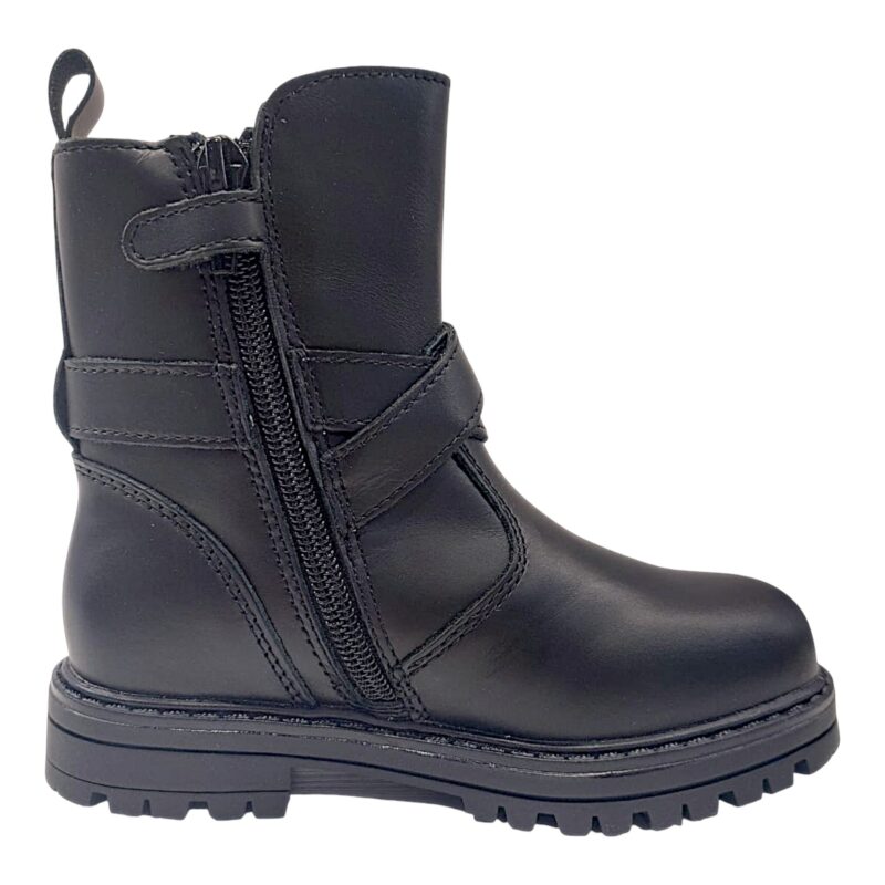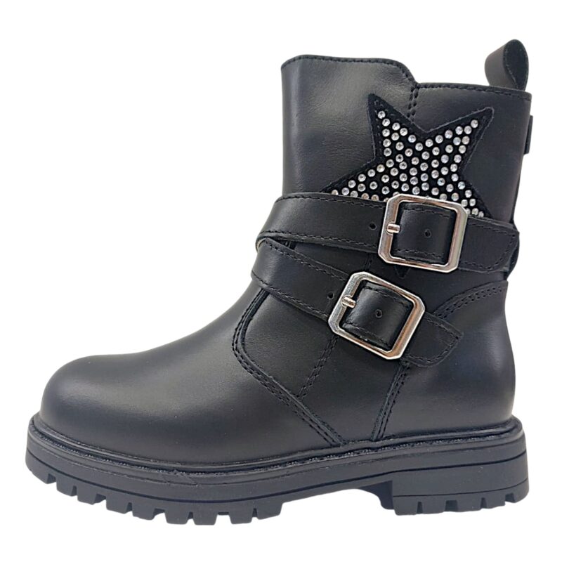 Realizzato in morbida pelle nera, questo stivale è impreziosito da una stella con brillantini che dona luce e personalità al design. Le due fibbie laterali completano il look con uno stile moderno e di carattere, perfetto per bambine che amano distinguersi.